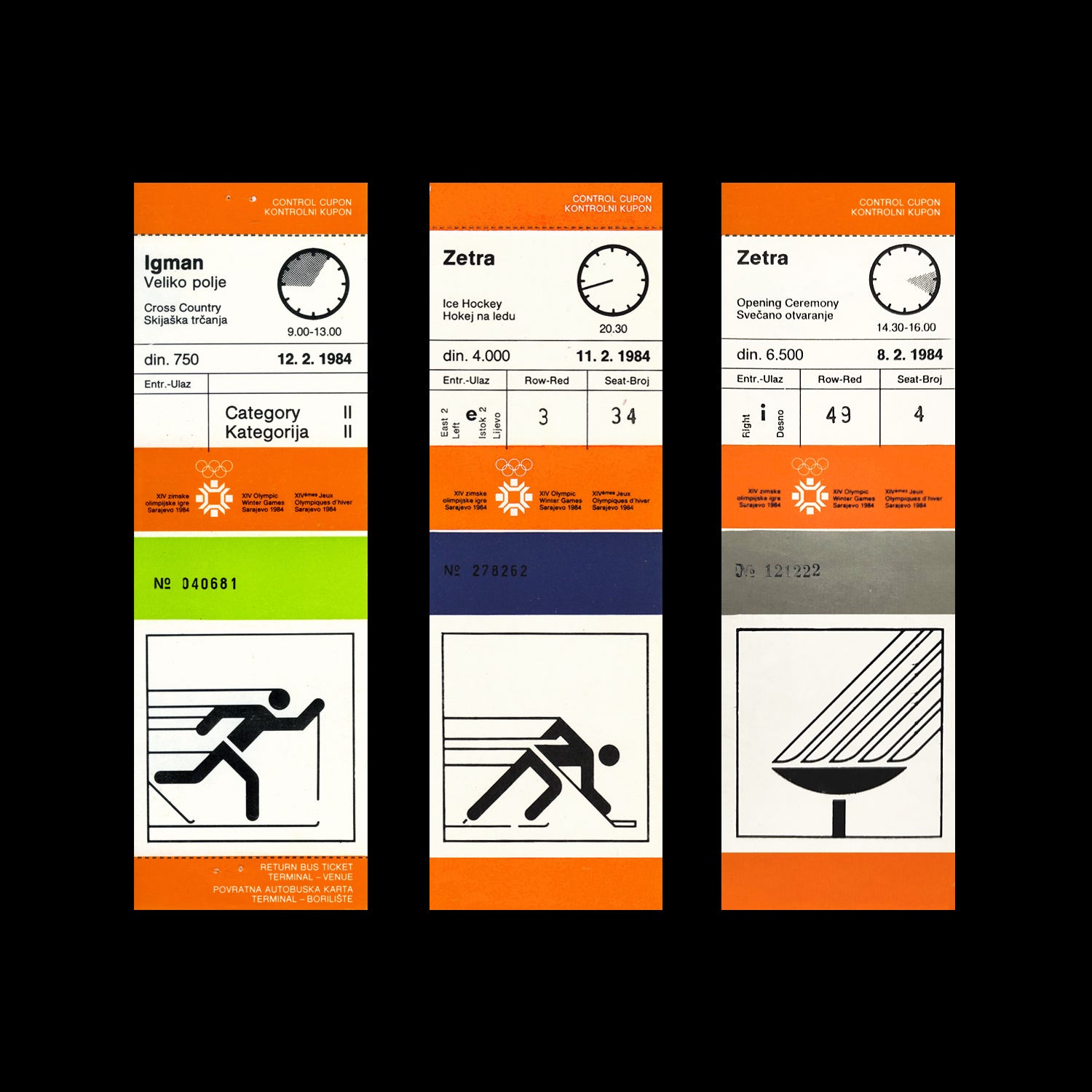 The symbol and Olympic Rings, as stipulated by the Graphics Manual, were to always be presented together, as a single solid colour or knocked out of a colour or image. ‘Sarajevo ‘84’ was added or excluded depending on the use-cases, appearing in its full form on the official poster or in a shorter form used on tickets.