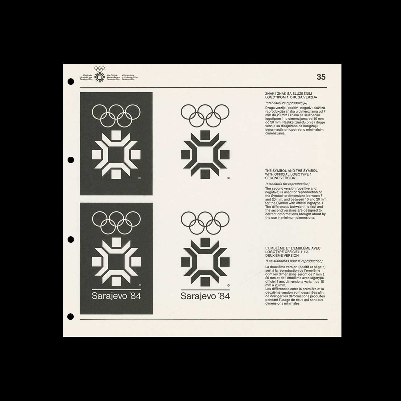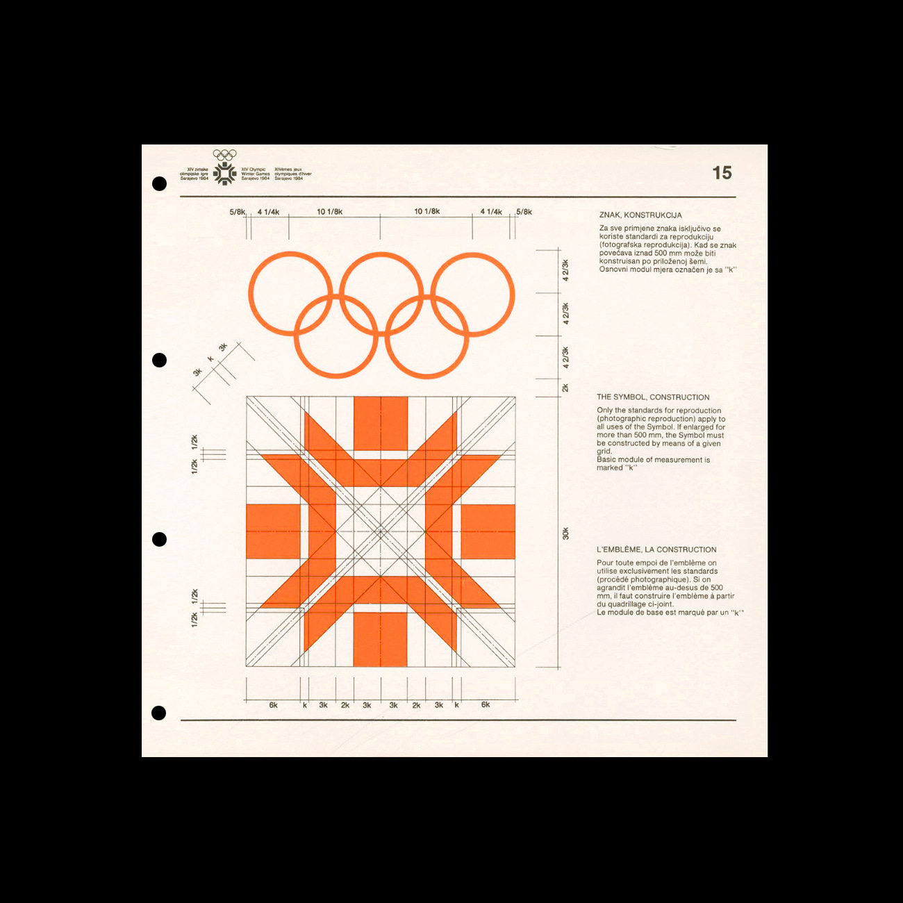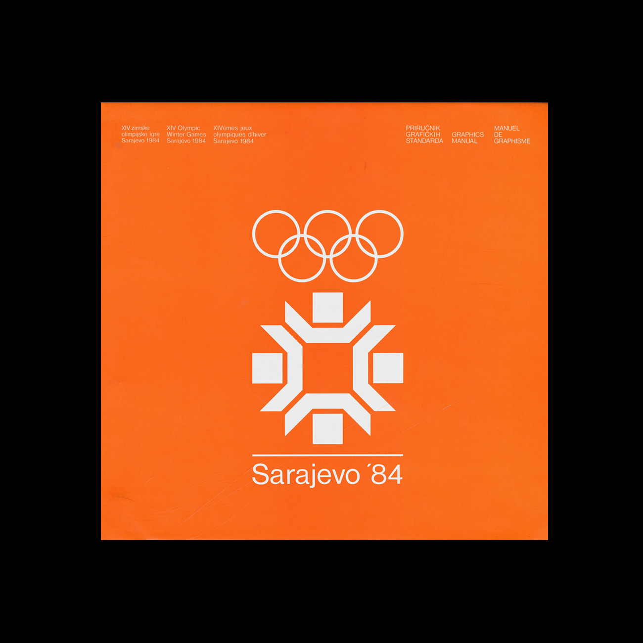 Unusually, although not a unique case, this candidacy logo was then used for the Games, with only small adaptions to the symbol, rings and typography being made by Branko Bačanović and Čedomir Kostović, who also developed the graphics manual. These adaptions moved the overall feel and composition away from the similar ‘totem’ structure of both Tokyo ’64 and Sapporo ’72, which also employed a thin frame, stacked elements and a condensed typeface. A small change was also made to the symbol itself.
