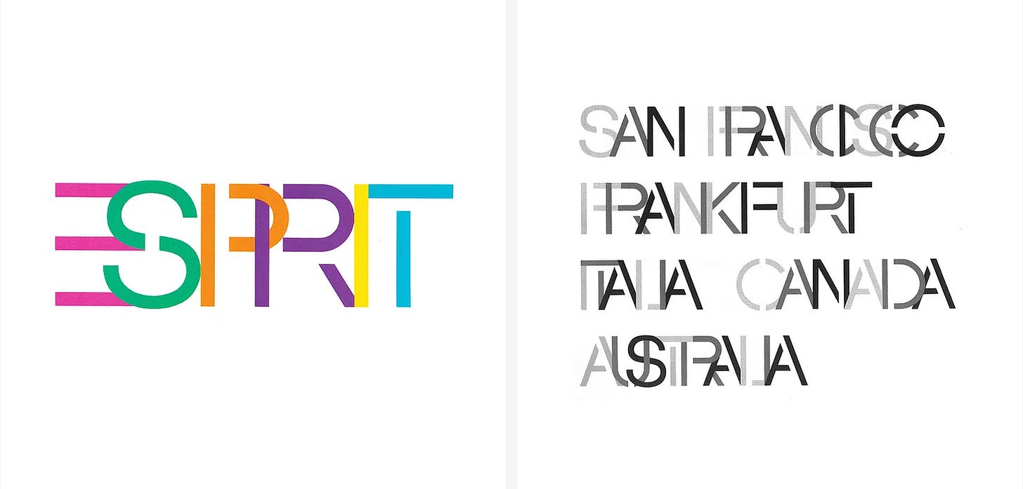 As the foundation of a new Esprit brand was a wordmark designed by John Casado in 1978–Casado also designed the trademark for the first Macintosh computer. The logotype was a derivative of Helvetica, a modernist and highly functional typeface. This was given a further sense of utility with the addition of stencil cuts and moments of reduction (the R) and redaction (the E). This was then redrawn, moving it further away from its formal origins. This would replace a wordmark that had become fixed to the 1970s zeitgeist in its letterforms affording the brand more range within the fashion world that was quickly evolving. The abstraction of letters and move towards simplicity freed the brand to be more flexible and playful, and was described being bold in the unambiguous appeal to a specific target audience.