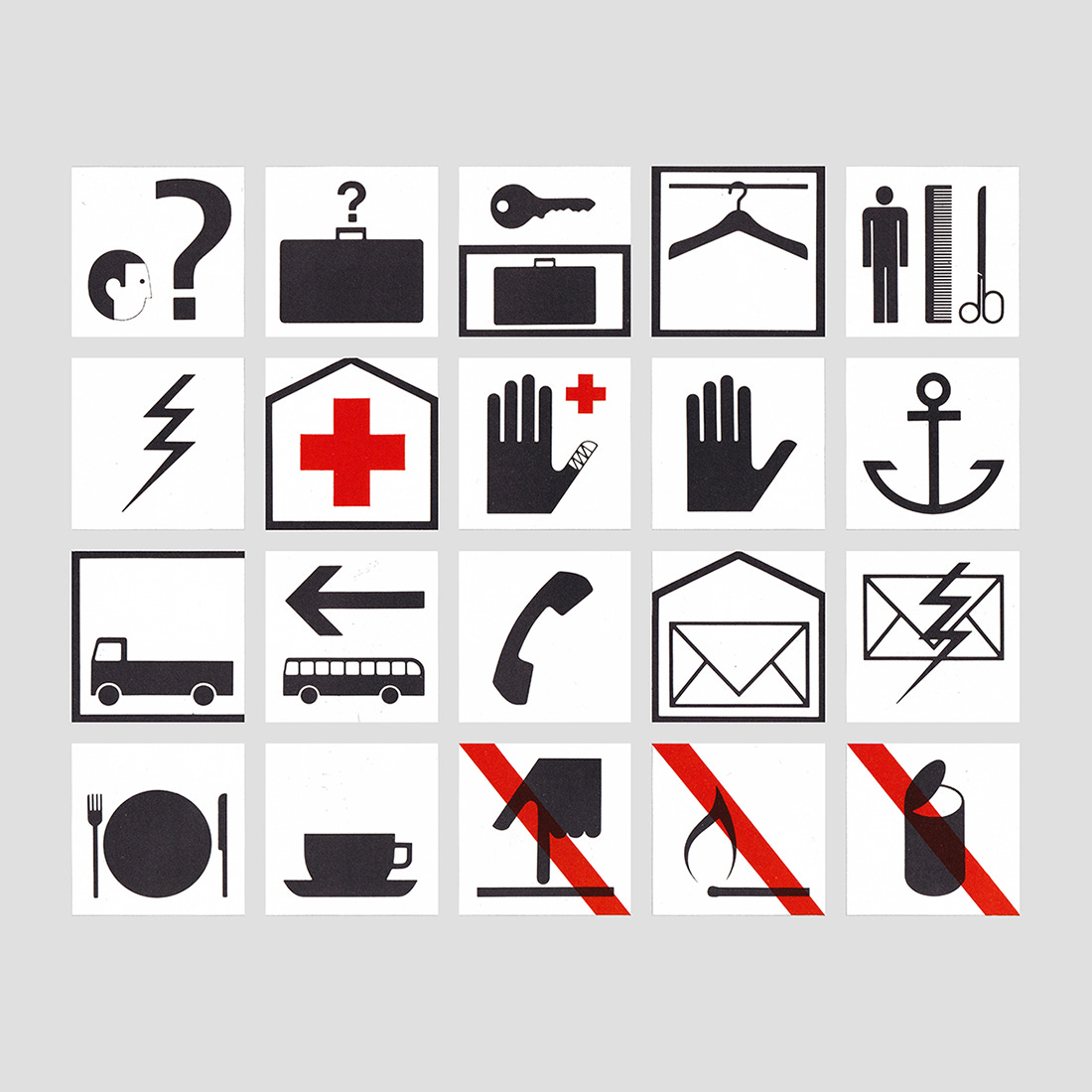 The design of EXPO67 was a monumental effort, and required a team of experts to carry out key tasks. One of which was the creation of pictograms. Animals in black silhouette were used to identify the various areas of the two giant parking lots, each of which accommodated roughly 12,000 cars. These were created by renowned Canadian designer Burton Kramer. Further pictograms were developed by Harry Boller for general amenities. These were printed black, except those activities that were prohibited and as well as the first-aid cross.