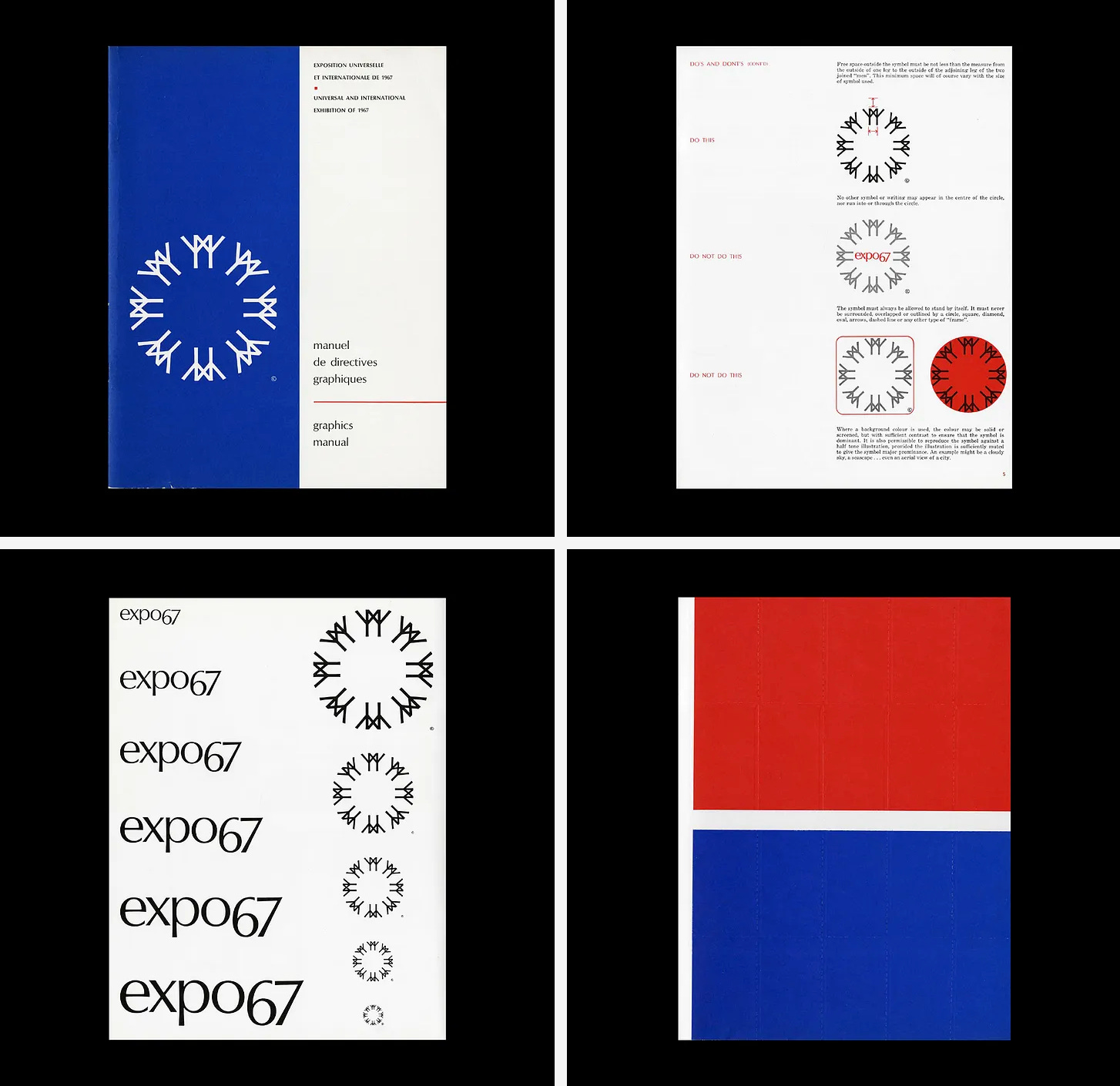 The official colours for the Exhibition, EXPO red and EXPO blue offered a simple solution to the bilingual requirements. Where both French and English were used, it was recommended that French headings be in blue and the English headings in Red, helping to delineate quickly between the two. This would also be supported by two different coloured symbols. A guideline was produced to oversee the basic and consistent application of symbol, logotype and colour.
