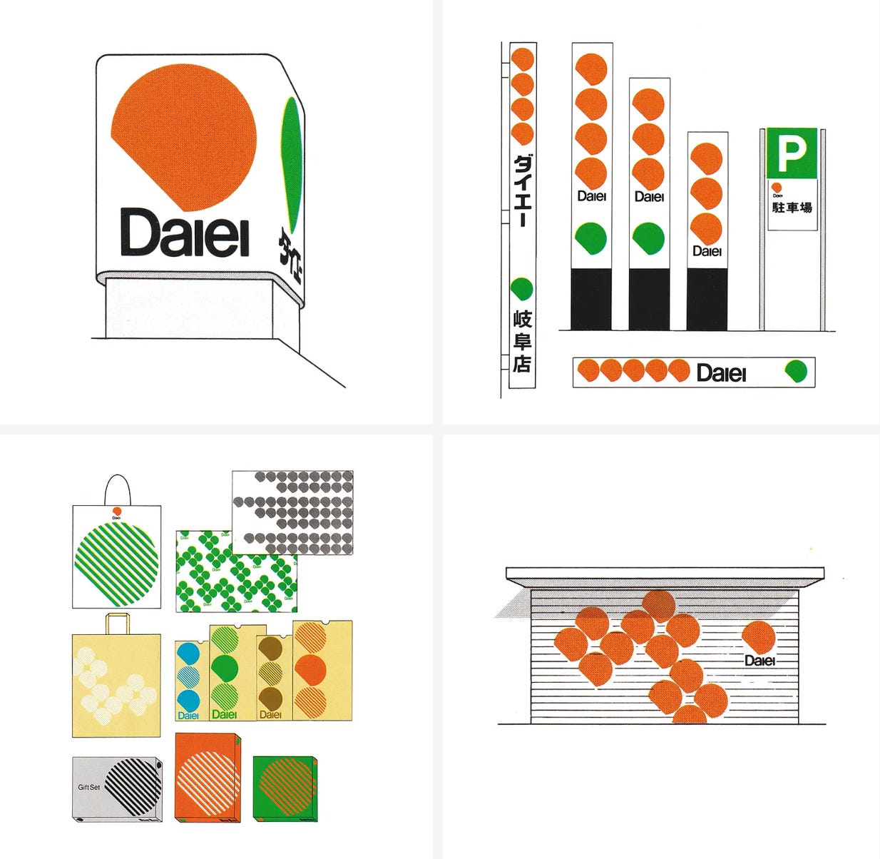 The following year, in 1973, Daiei formed a corporate identity team and approached PAOS – a design consultancy founded by “father of Asian Corporate Identity,” Motoo Nakanishi – to assist with the research and development of a new design system. PAOS (ASICS, Noritiz, Kenwood) coordinated a competition for the development of Daiei’s identity system, which began in April 1974.