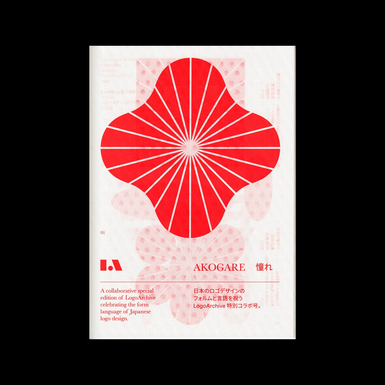 A Summer reissue of the D&AD award-winning LogoArchive Extra Issue Akogare designed by Hugh Miller. It is printed with a custom PMS mix of neon orange and red inspired by Japanese stamps. This has been applied to three A3 sheets of Takeo Tamashiki–a beautiful Japanese stock with a geometric watermarked pattern–and folded down into an A3 booklet. Hold it to sunlight and see the pattern and logos interact.