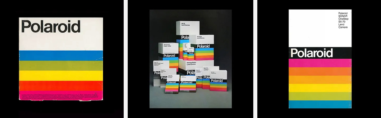 The approach introduced a unified and colourful visual identity for products such as Polaroid Sunglasses, Polaroid Colorpack and black-and-white film packs. The stripes were used to help differentiate between the Type 108 Colorpack Film and Type 107 black and white film, with the former using a five colours and the latter, a greyscale effect. These stripes afforded the corporation flexibility for differently proportioned and sized packs, and for the creation of product families.