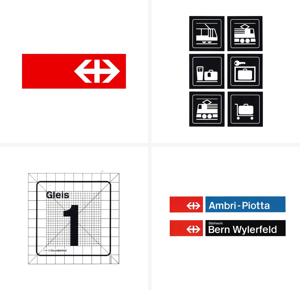 From 1978, the new signage system devised by Muller-Brockmann + Co., based around Helvetica and with custom-designed pictograms and arrows, covered all aspects of the SBB network. This included the numbering of platforms, departure and direction signs, the application of logo on rolling stock and the fabrication and placement of large format signage across SBB buildings.