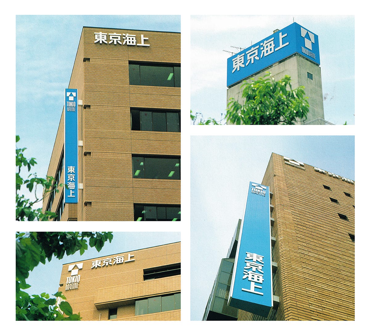 The extent of Tokio Marine’s visual presence extended to all types of signs, as well as printed items including business cards, letterheads, pamphlets, catalogues, business forms, and insurance policy certificates. The new corporate logo played a leading role across these items, while the brand name Tokio Marine had a supporting role.